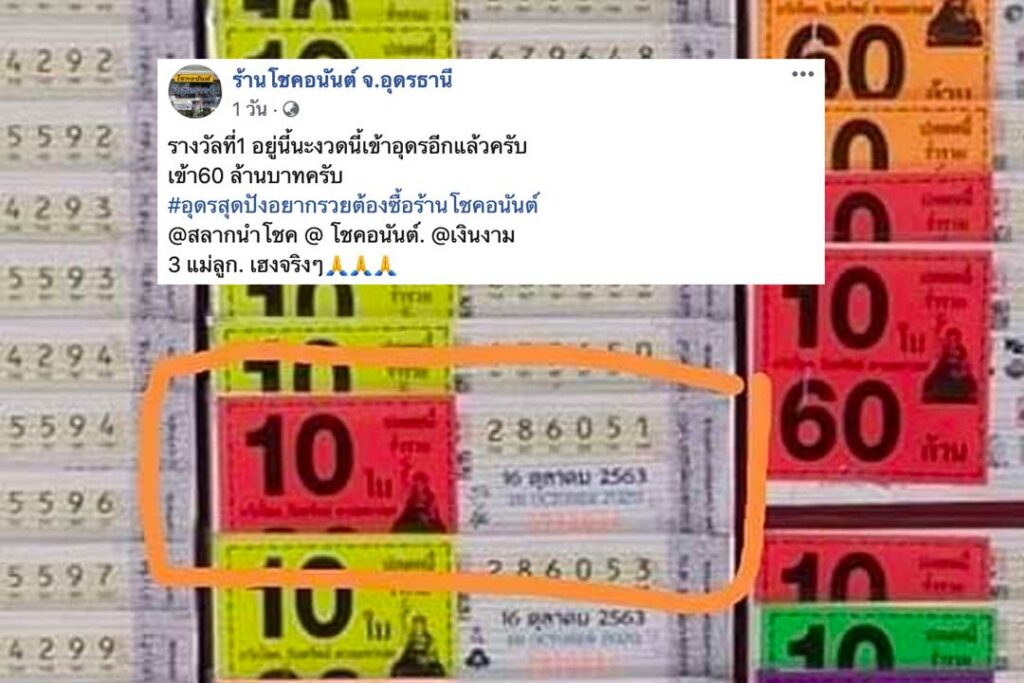 ภายหลังจากกองสลากประกาศผลการออกสลากกินแบ่งรัฐบาลงวดประจำวันที่ 16 ต.ค.63 โดยรางวัลที่ 1 ได้แก่หมายเลข 286051 ปรากฎว่า ในเฟซบุ๊ก ร้านโชคอนันต์ ร้านจำหน่ายลอตเตอรี่ในจังหวัดอุดรธานี ได้โพสต์ภาพสลากที่ถูกรางวัล ซึ่งมีคนซื้อไป 10 ใบเท่ากับ 60 ล้านบาท ชาวเน็ตถึงกับสงสัย ใครกันนะที่ดวงเฮง