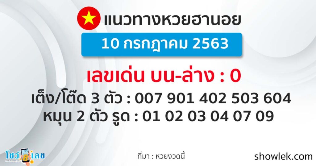หวยฮานอย หรือ หวยเวียดนาม งวดวันที่ 10 กรกฎาคม 2563 โชว์เลขดอทคอม ขอนำเสนอ แนวทางหวยฮานอย 10 ก.ค. 63 เลขท้าย 3 ตัว และ 2 ตัว จากสูตรหวยเวียดนาม ไม่พลาดทุกเลขเด็ด แม่นทุกงวด มีให้ลุ้นกันทุกวัน