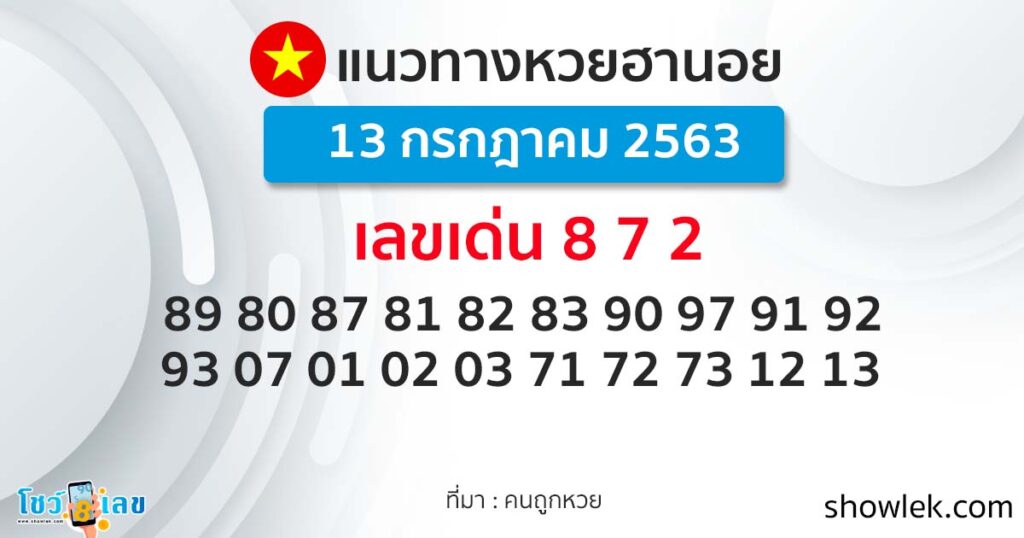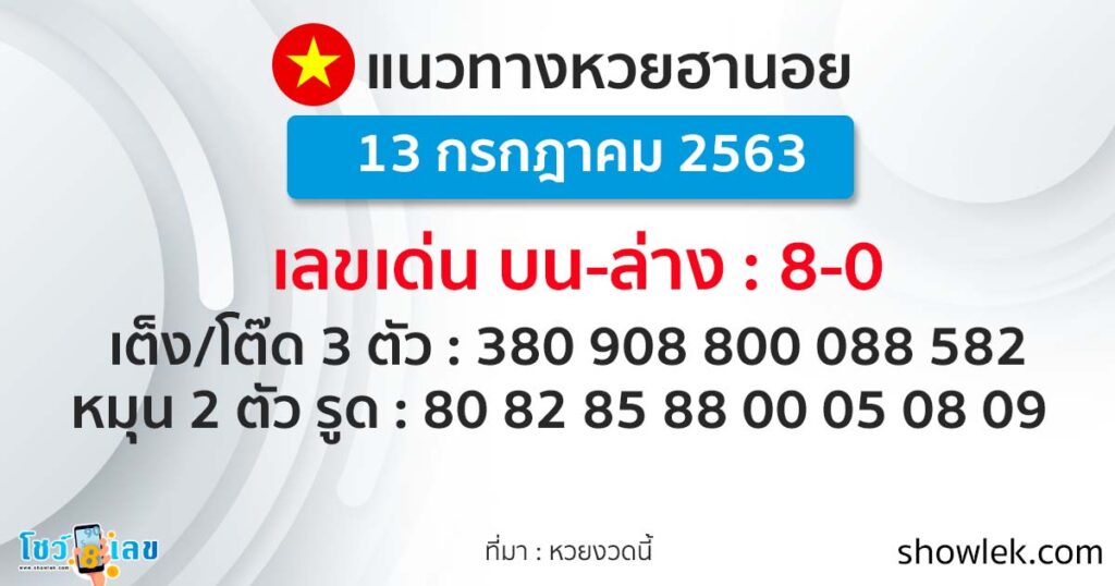 หวยฮานอย หรือ หวยเวียดนาม งวดวันที่ 13 กรกฎาคม 2563 โชว์เลขดอทคอม ขอนำเสนอ แนวทางหวยฮานอย 13 ก.ค. 63 เลขท้าย 3 ตัว และ 2 ตัว จากสูตรหวยเวียดนาม ไม่พลาดทุกเลขเด็ด แม่นทุกงวด มีให้ลุ้นกันทุกวัน