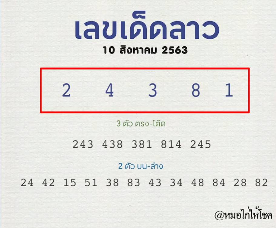 แนวทางหวยลาว เลขเด็ด หมอไก่ให้โชค งวดวันจันทร์ 10 สิงหาคม 2563 หมอไก่ให้เลข 2 – 4 – 3 – 8 – 1 เลขเด่น 3 ตัวตรง-โต๊ด 2 ตัว บน-ล่าง จับคู่ตามนี้เลย