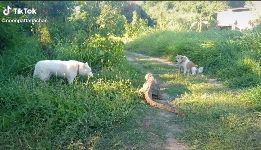 ผู้ใช้ Tiktok “This is นุ่น” ได้โพสต์คลิปวินาทีที่ตัวเงินตัวทองสุดห้าว ใช้หางฟาดหน้าเจ้าหมาเจ้าถิ่น 2 ตัวที่ยืนเห่าอยู่ โดยเฉพาะเจ้าตัวสีขาวฝั่งซ้ายที่โดนฟาดไปเต็ม ๆ เจ็บไหมไม่ต้องถาม